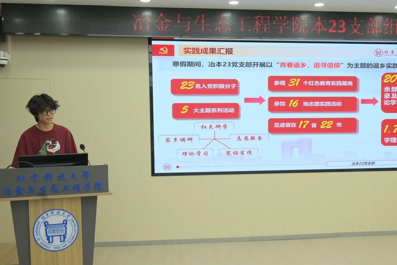 第二部分党支部围绕假期实践活动,进行成果的回报和总结,集体观看了活动总结视频,并且由冶金2303程明宇为代表进行假期成果汇报。