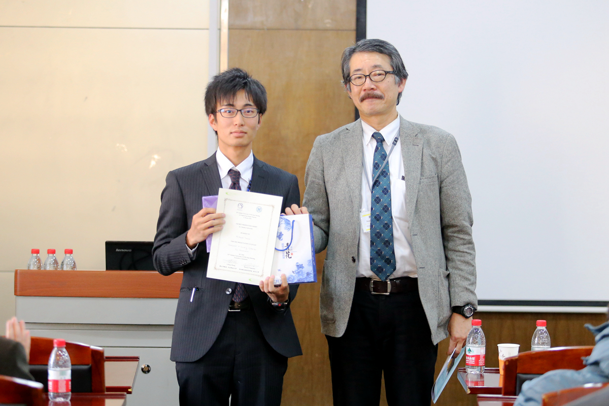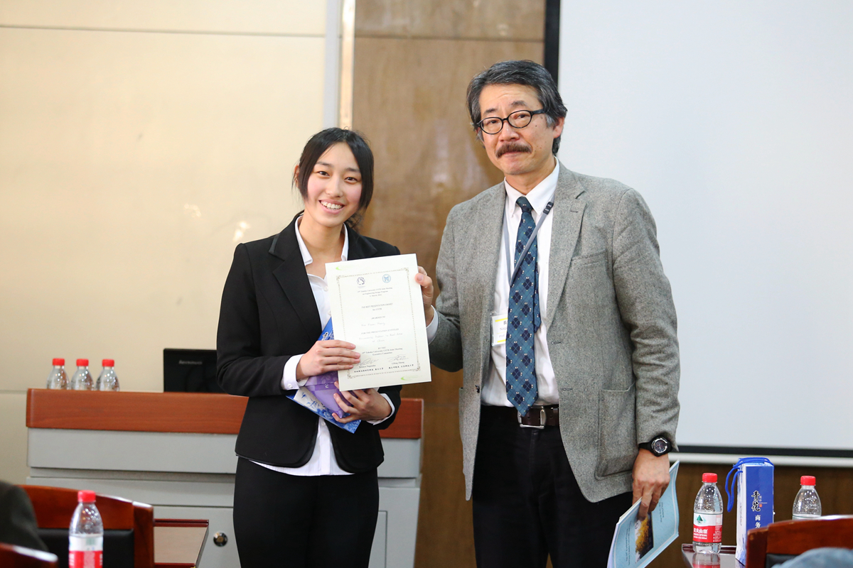 开幕式结束后,两校青年学生开展交流活动。在第一分会场,28名两校学生代表在长坂也教授的主持下依次上台,向在场同学们汇报了研究学习中的收获心得。日本东北大学工学部副教授伊丽莎白,冶金学院副院长李宏煦、陈骏,青年教师杨文等参加学生研习交流活动并进行指导。日方学生渡边千宽引导在场的同学们走进五彩斑斓的金属薄膜色彩世界,西村肇伦介绍了利用花瓣色素制成太阳能电池的原理,山田加奈子展示了用电化学方法在钛金属表面绘画的全过程,日方学生的创意和思路赢得中方师生的赞赏。我校学生张亚菲运用电镜图片介绍了非金属夹杂物对钢铁疲劳性能的影响,李瑶介绍了对高铝低密度钢组织和性能的研习情况,黄心眉以科学视角介绍了中国农村的环境污染现状,中方学生的踏实和细致赢得了日方师生的肯定。在交流活动中,同学们认真聆听,踊跃提问,相互学习,取长补短。长坂也教授为获得本次交流活动优秀奖的两校学生颁奖。