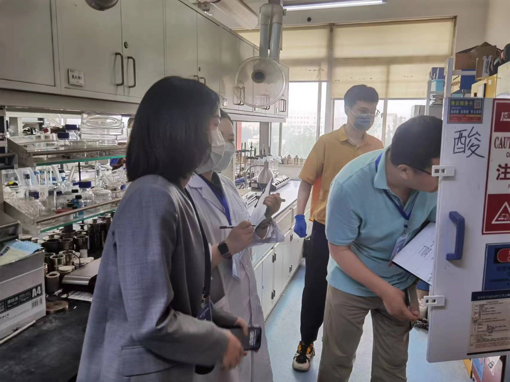 上午8点,专家和各单位分管领导、安全秘书按照路线开始检查。检查内容为对照《实验室危险化学品安全管理规范》(DB11/T 1191.2普通高等学校)要求,重点检查实验室危险化学品安全管理的组织、制度、人员培训、安全设施设备、采购管理、储存管理、使用管理、危险废物管理和应急管理等内容,进一步摸清涉危使用实验室的基本情况和管理现状,查找实验室危险化学品安全管理中的薄弱环节和突出问题。