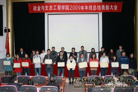 在雄壮的国歌声中大会拉开了序幕。院党委副书记董春阳老师宣读了tyc7111cc太阳成集团2009年表彰名单。全国挑战杯科技作品竞赛二等奖《中国古代大型铁质文物保护现状及其文化价值调研报告》的第一作者冶研08级王丽莉同学、北京市红色“1+1”活动三等奖、宝钢特等奖学金、优秀辅导员、院长成就奖、先进班集体标兵、校优秀学风班、校先进班级体、校标兵宿舍、研究生“十佳学术之星”、社会实践活动金奖团队、钢铁模拟冶炼大赛金奖、学院先进班集体、热心支持学院工作班级等荣誉获得者依次上台领奖。