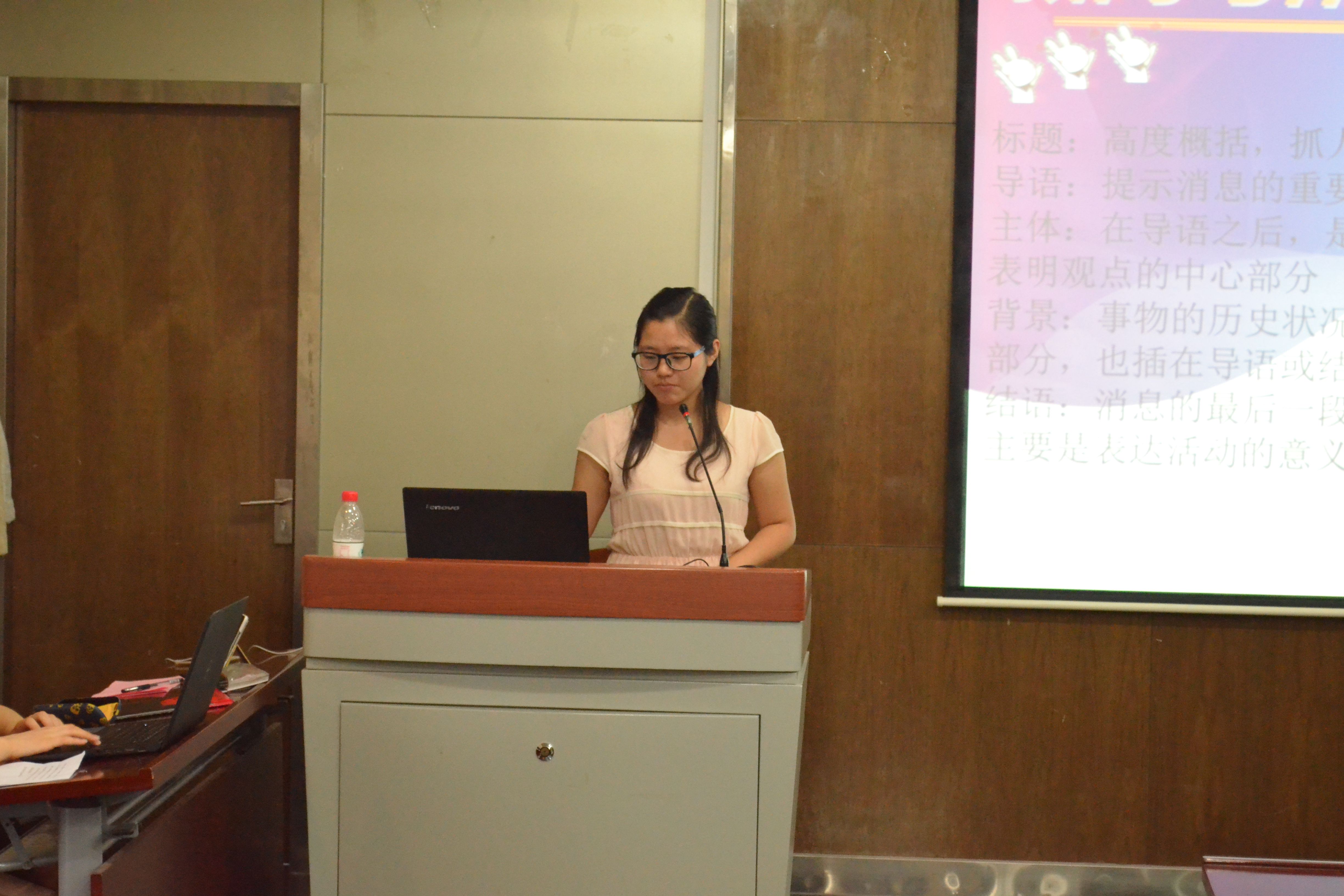 首先,新闻中心副主任王春阳以“新闻的创作”为主题,从新闻稿的写作、活动照片的拍摄以及新闻稿的上传机制三方面进行了详细的解读。在强调新闻稿的准确性、时效性与真实性以外,她指出,要想写出一篇高质量的新闻稿,写好第一段是关键,倒金字塔式的内容堆叠会使整篇文章看起来更加层次分明,结尾处活动意义的总结则要言简意赅,突出重点。