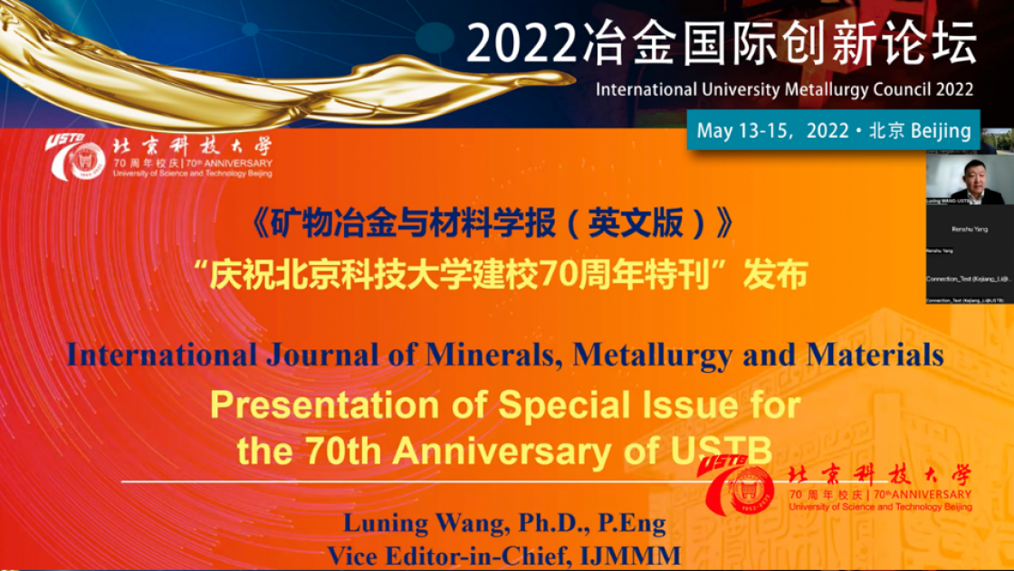 副校长、《矿物冶金与材料学报(英文版)》(IJMMM)副主编王鲁宁作开幕式特邀报告,宣布校庆特刊的发布。特刊由中国科学院院士徐冠华作序,并邀请了全球矿业工程、冶金工程、材料科学与工程领域28位院士和高水平学者就相关领域的发展前沿、研究现状、技术挑战、创新成果与未来展望进行研究和综述。与会嘉宾与我校师生、期刊读者和作者们共同见证了学校70年成长壮大的辉煌历程。