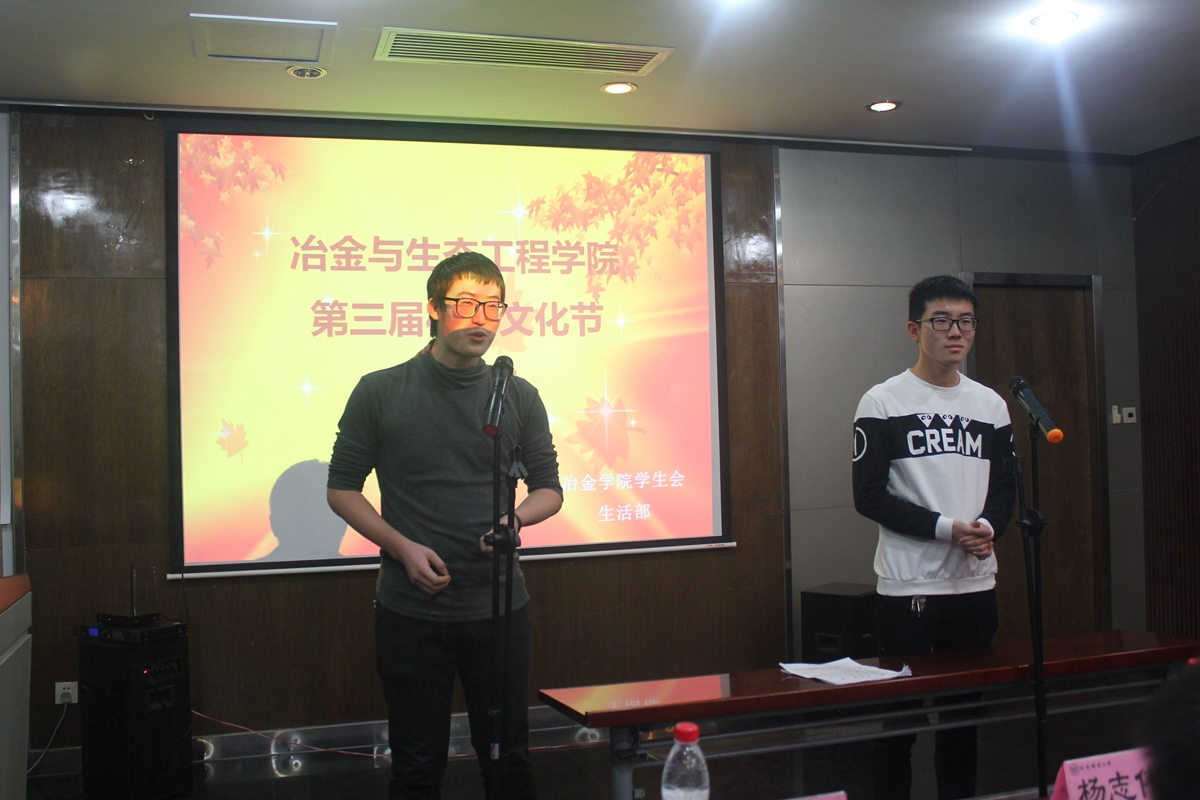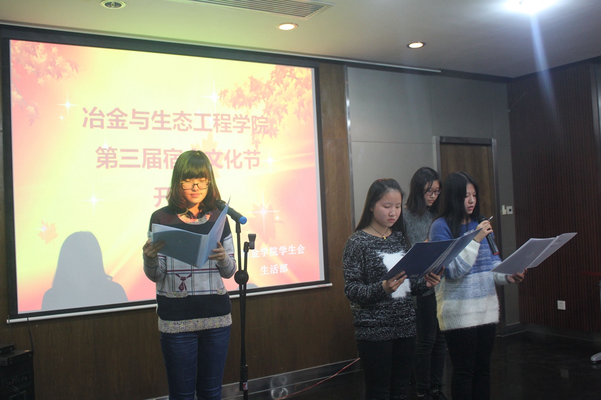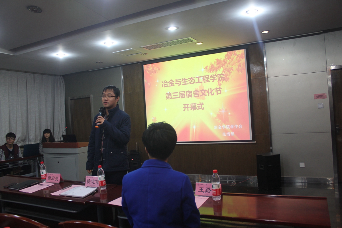 为增强宿舍成员之间的凝聚力,加强宿舍成员沟通交流,丰富同学们的宿舍文化生活,营造良好的宿舍文化氛围,11月4日晚,预计为期一个月的tyc7111cc太阳成集团第三届宿舍文化节在冶金生态楼开幕。tyc7111cc太阳成集团团委书记杨志伟老师、学院本科2015级辅导员陈曦老师,学院团委学生会主席谢宏亮同学、副主席王路召同学出席开幕式,学院本科2013级标兵宿舍长代表、本科2014级宿舍文化节获奖宿舍学生代表应邀参加开幕式。开幕式由学院团委学生会生活部部长陈琳同学主持。