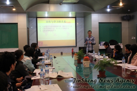 随后,新闻社副社长周超为大家介绍优秀宣传班级的评选过程。从他们认真的听讲可以看出,积极活跃的10级同学正摩拳擦掌,准备一展风采了。