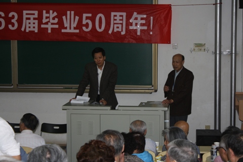 参观结束后,由老校友吴绍昌主持,大家在冶金楼110教室召开了见面会。首先,李士琦校友为大家介绍了到场的领导和校友。随后,学校领导向到会校友致辞。武德昆副校长对各位校友重返校园、回家团聚表示欢迎,并在回顾学校当年情况的基础上,为大家介绍了学校的发展。原副校长戚以新教授回忆了当年大家在一起上课、学习的情景,并对大家再次相聚表示由衷的高兴。