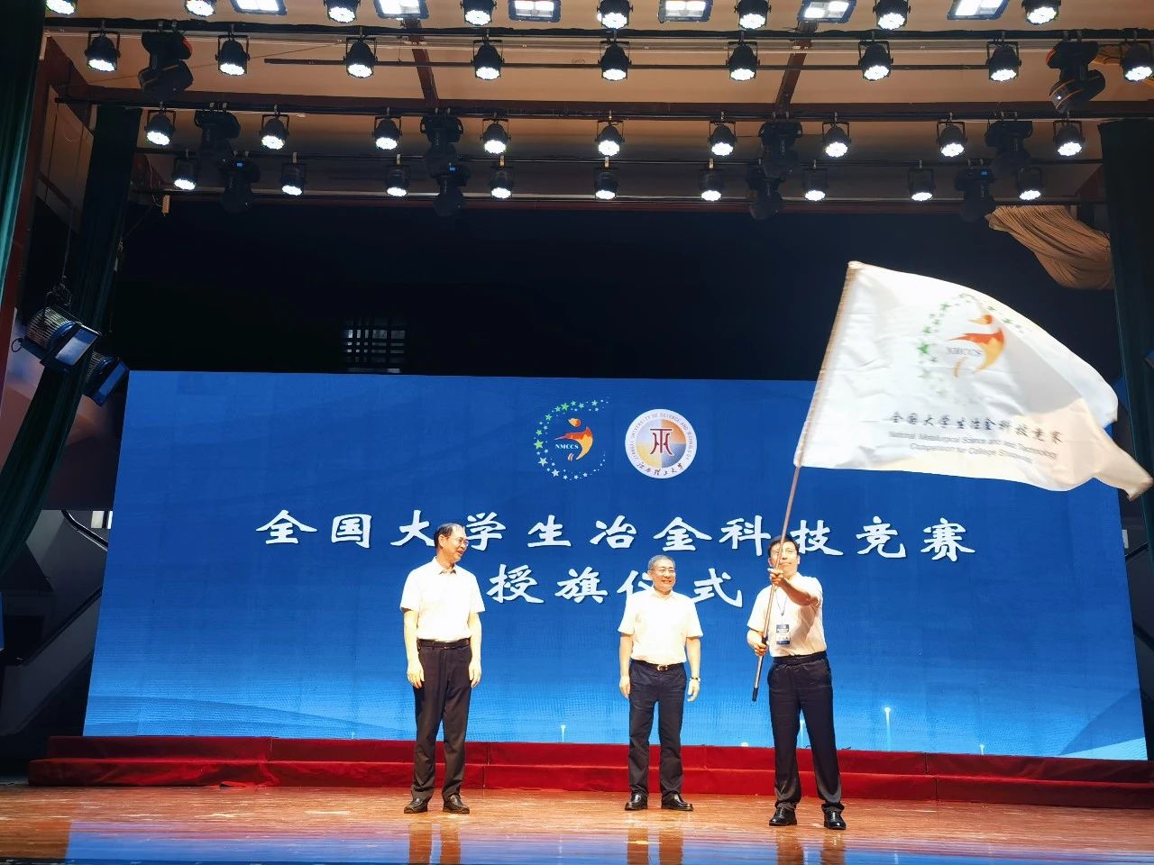 在会旗交接仪式上,江西理工大学副校长廖春发把大赛旗帜转交到中国金属学会秘书长王新江手中,再由王新江授予第八届大赛承办单位太阳成tyc7111cc,宗燕兵郑重接过了大赛旗帜。