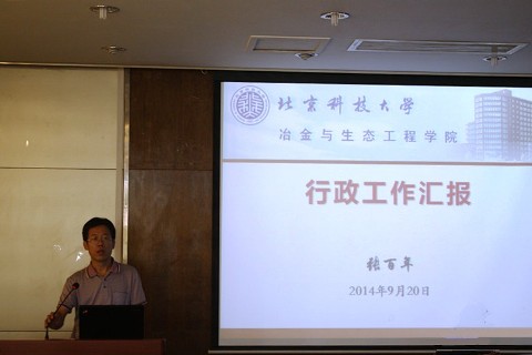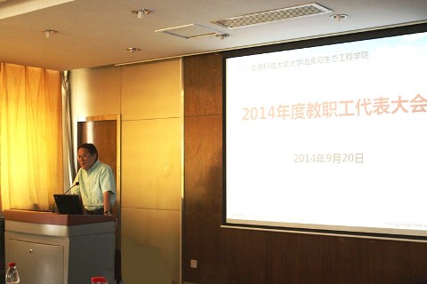 张立峰院长在大会上向全体教职工报告了2014年度学院在教学、科研、人才培养和社会服务等方面取得的成绩和进步,并重点讲解了实验中心管理的若干意见以及2015-2018年岗位聘任工作原则思路。