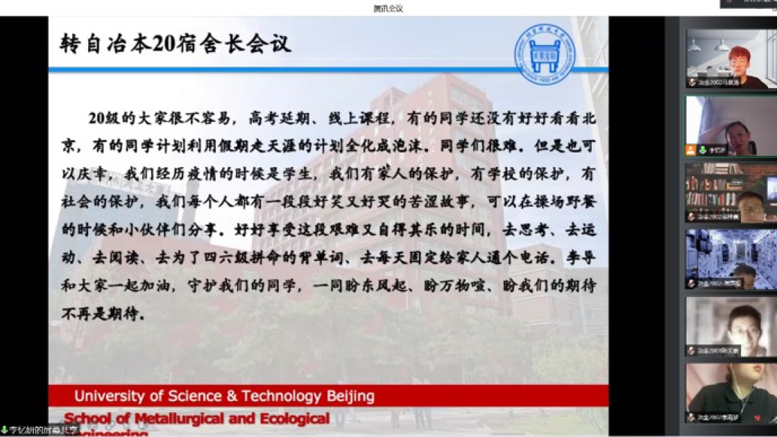 5月16日下午,疫情防控工作线上会议召开,冶金党委全体班子成员、系所负责人、师生党支部书记、学生辅导员、宿舍长、防疫委员共200余人参加会议。tyc7111cc太阳成集团党委书记张建良主持会议,他指出,作为冶金师生中的骨干力量,要统一思想,站在讲政治的高度,坚持以习近平新时代中国特色社会主义思想为指导,深入学习贯彻习近平总书记关于教育的重要论述以及给我校师生重要回信精神,全力守护师生员工健康安全,扎实推进各项事业发展。