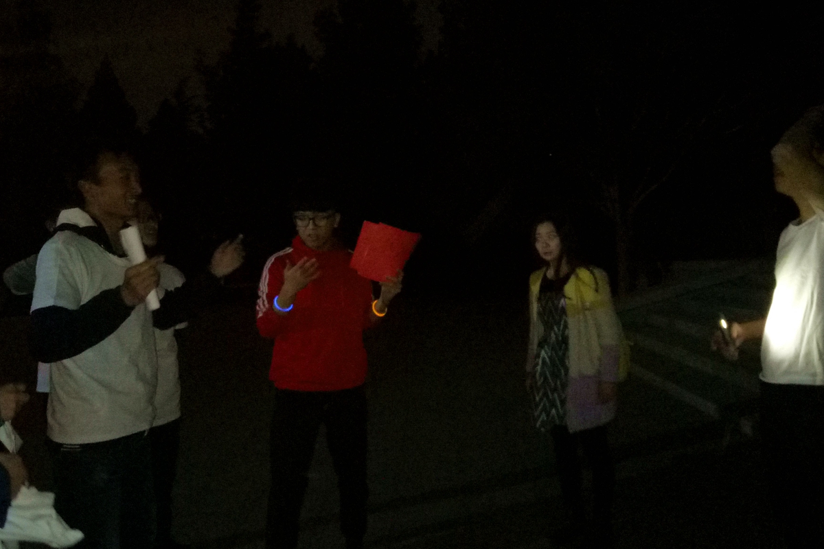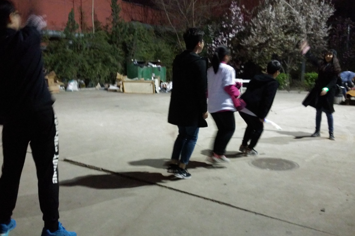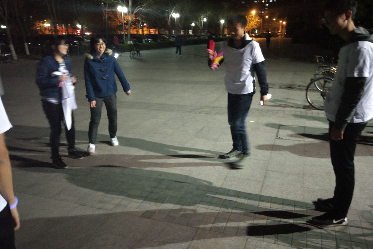 3号站点在毛主席像东侧,裁判是戴承硕和马瑞同学。参赛者来到本站点需要挑战你画我猜,游戏考验参赛队员的默契以及表演能力,时而幽默搞笑,时而配合默契。4号站点在冶金楼后的庭子,马双飞和卜雨杉同学担任裁判。跳绳是小时候的活动,既锻炼身体,又增进同学的友谊。完成挑战后在裁判做记号的时候,有调皮的队员要求画萝卜,让裁判哭笑不得。5号站点在一斋后化生楼前的空地,李洋和孙亦鹏同学担任裁判。比赛结束后手中的荧光棒也被参赛队员洗劫一空,同学们玩的好不热闹。