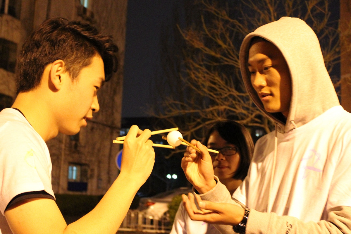 1号站点设置在五环广场,学生会主席邓雨平和新闻中心主任赵子晗同学担任裁判。参赛选手需要找本队人数的二分之一位路人分组踢毽子,每组至少两名队员,一位路人,连续完成十个即可过关。这项游戏考察了参赛人员身体协调能力和组员默契程度,有利于团学内部建设。2号站点在八九斋东侧花园,裁判是王甜雨和吕彬玉同学。参赛者在回答了“西门的毛主席像伸的是哪只手”这个问题后才可进入游戏环节。游戏是参赛者相互传递乒乓球并且保持球不掉落,有些成员夹着的乒乓球自由落体而有些成员则夹着乒乓球健步如飞。