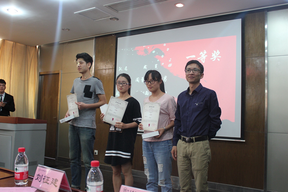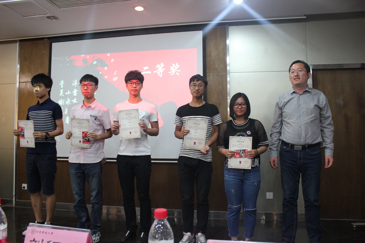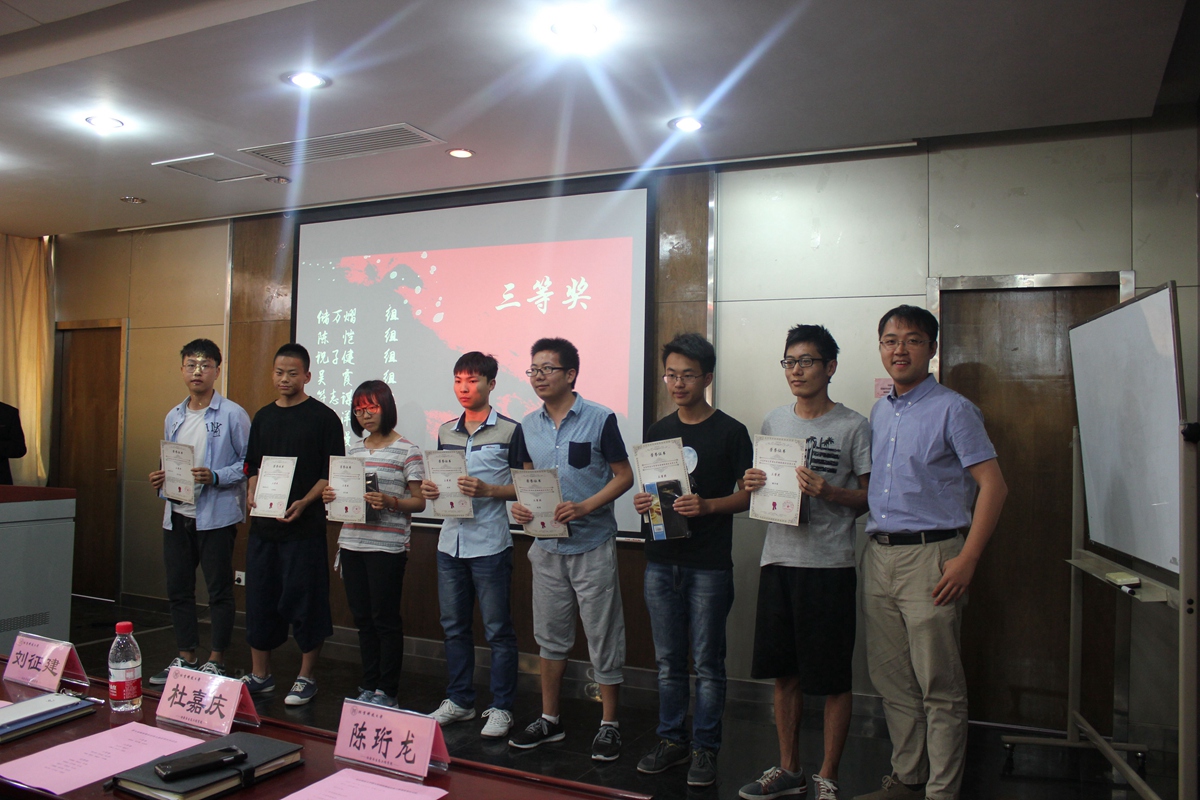 颁奖典礼伊始,主持人介绍了今年钢模大赛的概况并公布了获得本届一等奖、二等奖、三等奖以及优秀奖的团队名单。王斌老师、刘征建老师、杨志伟老师分别为为获得一、二、三等奖的团队颁发荣誉证书及奖品。获得一等奖的团队分别为陈柯霏、庞雪鹭、朱莉杰团队;二等奖团队分别为:李洋、吴小雷、谢永节、王敏⼒、王春阳团队;三等奖团队分别为:储万熠、陈恺、祝⼦健、吴霞、符志谋、李海洋、尹昱鳗团队;获得优秀奖的团队分别为:刘英聪、邬浩天、周敏、时婧芸、刘勋、罗卓尔、杨⽂⼴、吴松杰、连雪婷、肖斌、江暘暘、周⽂勃、胡⼦星、亢少华、王舜铎团队。