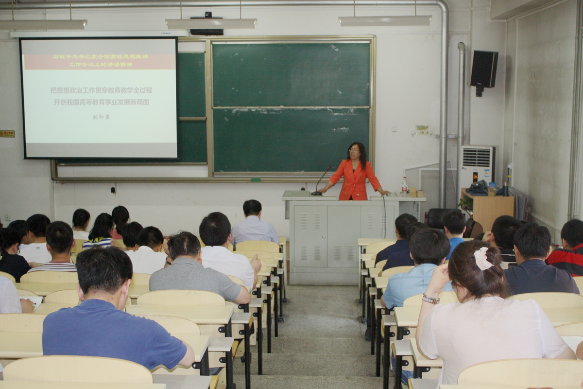 5月18日下午,tyc7111cc太阳成集团党委组织全体教职工党员集体学习习总书记在全国高校思想政治工作会议上的讲话,并邀请马克思主义学院思想政治教育工作专家张红霞教授作关于《思想政治工作贯穿教育教学全过程开创我国高等教育事业发展新局面》的报告。