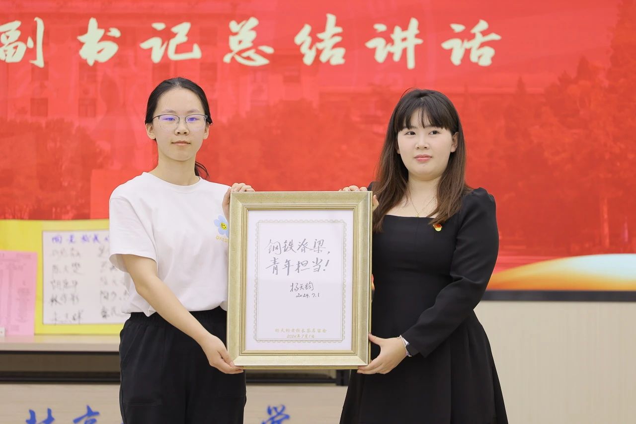 理化系副主任张杰、辅导员李忆妍为杨天钧老校长献花。杨天钧老校长为青年教师题字——钢铁脊梁 青年担当,勉励青年教师为铸就科技强国、制造强国的钢铁脊梁作出新的更大贡献。