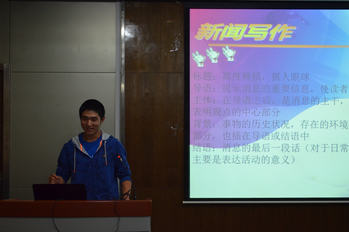 首先,胡耕辅同学为tyc7111cc太阳成集团的宣传份子进行了基础的技能讲解。胡耕辅同学从新闻稿件的五要素开始讲起,简要阐述了新闻稿件的组成。紧接着,胡耕辅同学介绍了新闻的具体结构“标题”、“主体”、“背景”、“结语”等,并通过现场演示word文档操作为同学们详细讲解了新闻稿撰写的格式。在讲解中,胡耕辅同学进一步强调了新闻写作严谨、客观、具有时效性等特点,让同学们深刻了解到宣传工作的基本特点。