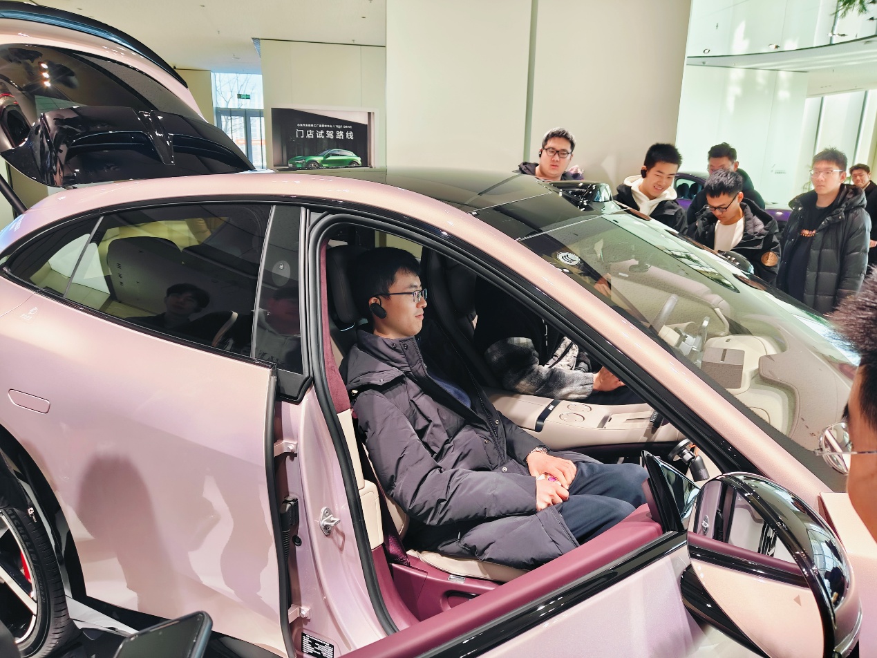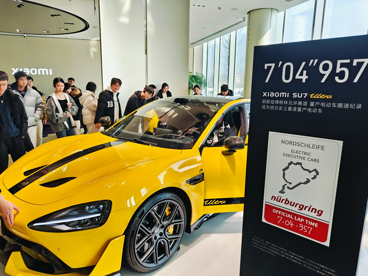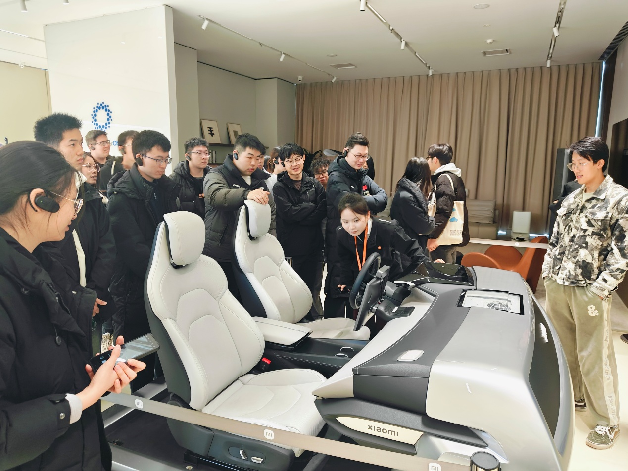 参观首站,师生一行抵达小米汽车工厂综合楼,依次参观零售展厅与技术展厅。在零售展厅,小米工作人员详细讲解了小米汽车的设计理念、性能参数及核心优势。