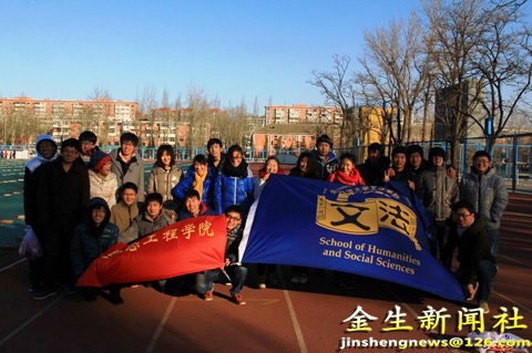 为了加强学生爱国主义教育,激发同学们的爱国热情,我院与文法学院联合组织了今天的接力比赛。比赛规则是每个学院各出六支队伍,我院每个小组由四个男生和两个女生组成;相反,文法学院的每个小组由四个女生和两个男生组成。每个学院出一组与另一个学院的一组组成一支队伍,这样十二个小组就组成了六支比赛队伍。虽然冬天的北京寒风凛冽,但是这丝毫不影响同学们的比赛热情,参赛同学奋力奔跑,场下同学呐喊助威,让整个操场显得活力四射。