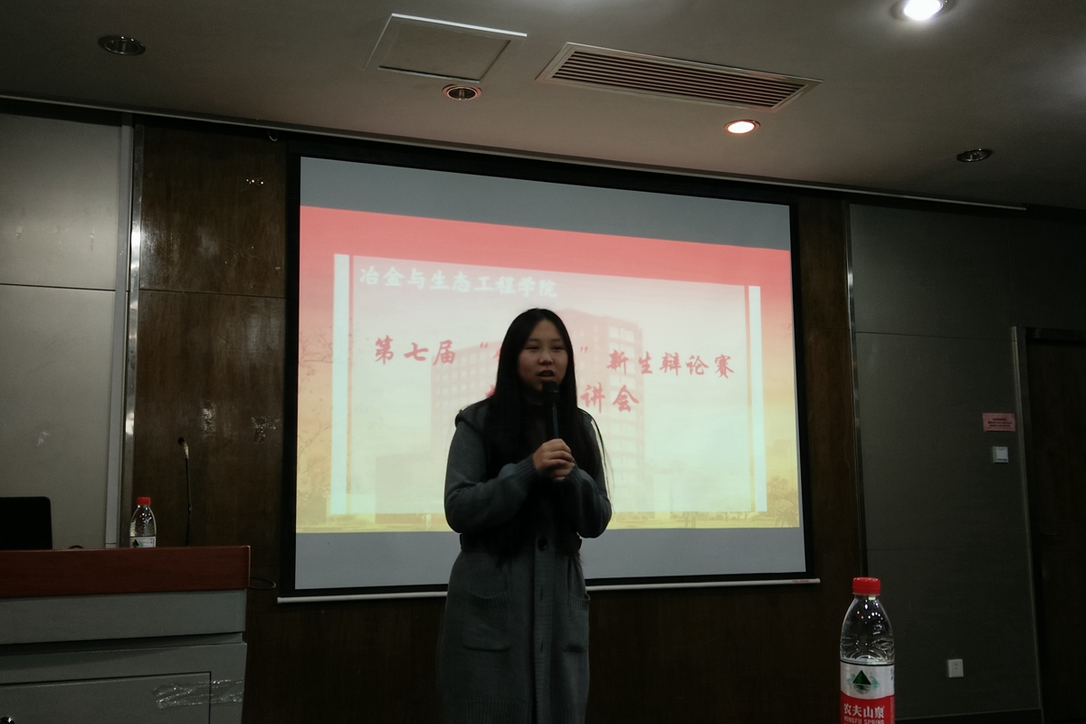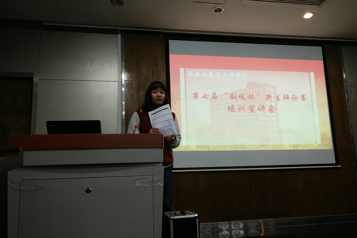 10月16日晚,tyc7111cc太阳成集团第七届“钢魂杯”新生辩论赛培训宣讲会在冶金楼青钢报告厅顺利召开。本次培训宣讲会由冶金1502班王甜雨同学主持,校立言辩论队队长樊婧同学、副队长张静远同学、程婉婷同学对参赛者进行了关于辩论赛的准备工作、辩论技巧和答辩礼仪等方面的培训。