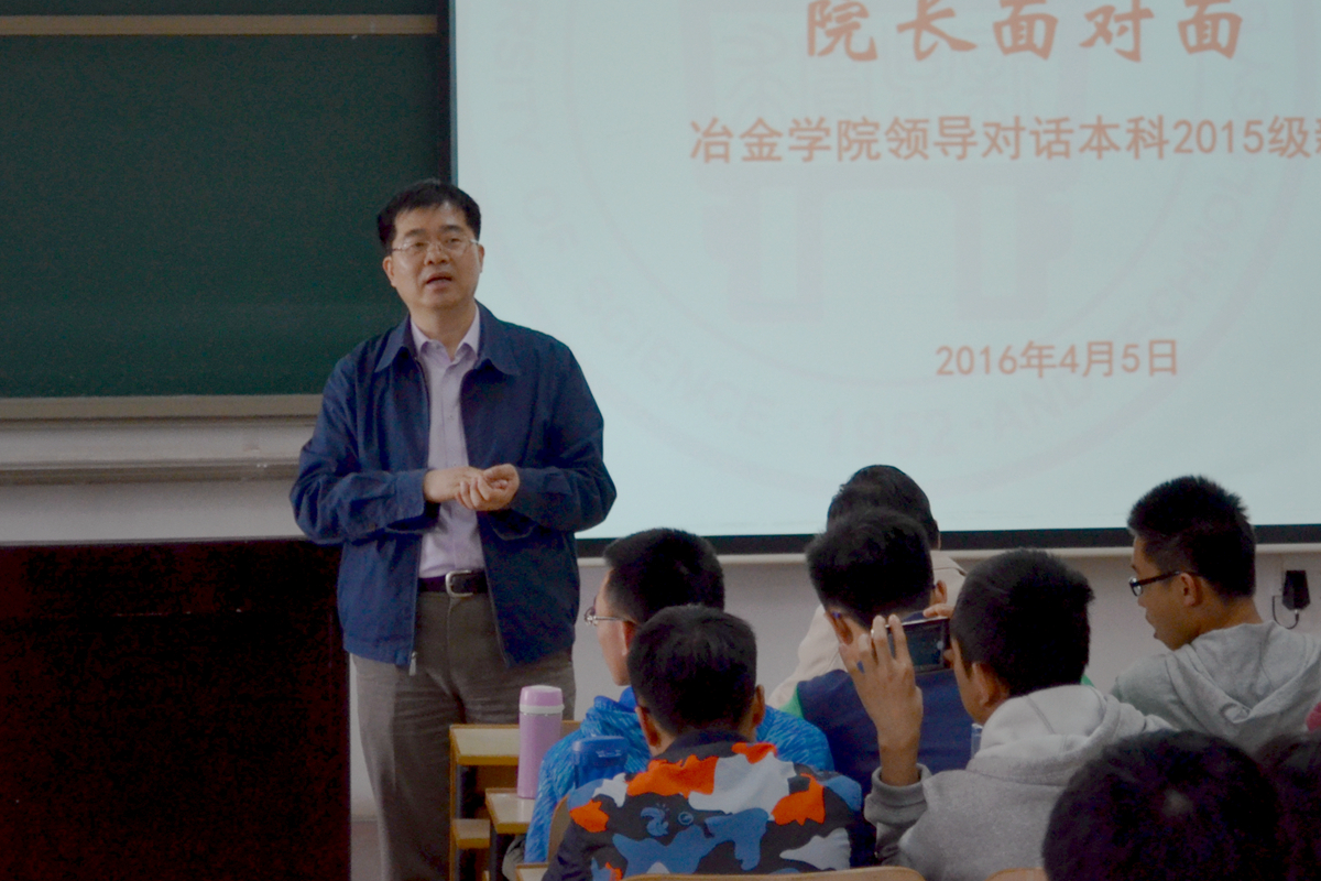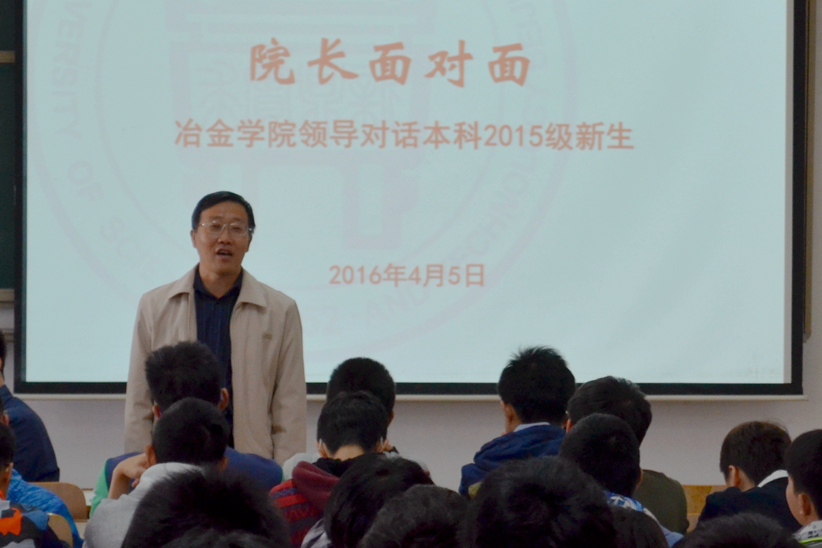 4月5日上午,冶金学院2016年专业宣讲系列活动之 “院长面对面:冶金学院领导对话本科2015级新生”在逸夫楼举行。学院院长张立峰教授、党委书记张建良教授、副院长李宏煦教授、副院长兼党委副书记王春义老师等学院领导与本科2015级全体新生同学们进行对话。活动由学院辅导员陈曦老师主持。